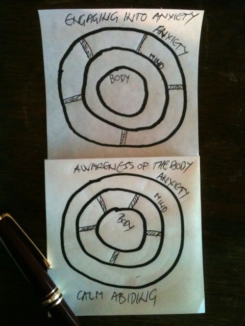 On the first drawing you are enageging into the anxiety. On the second you are learning through calm abiding to shift those bridges to connect to the body and calming it, relaxing into it. Like this the anxiety still remains but looses power because those bridges gives it power. Those bridges are the power cords for the anxiety to exsist. Dont cut the power cords but shift the the other way and connect to the body instead by doing calm-abiding.